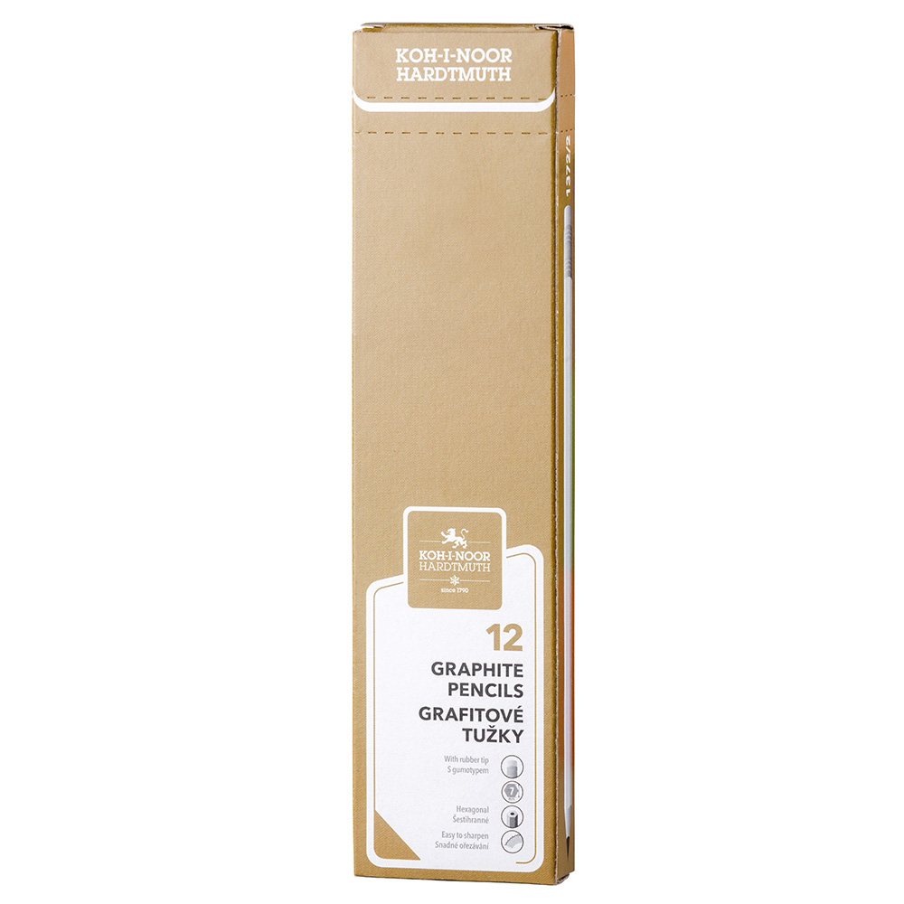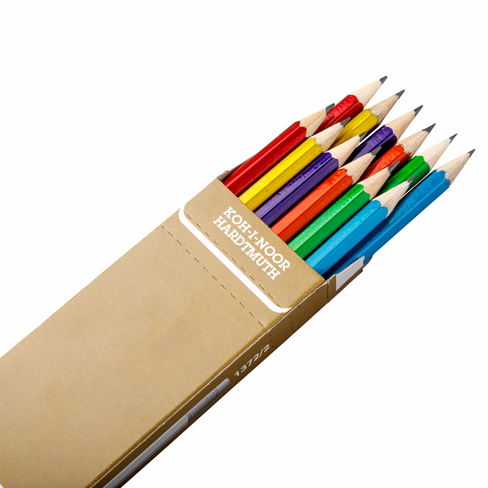 Hexagonal pencils in wooden envelope with graphite lead class 2/HB. The pencils in six shades with metallic surface, 6 colour shades of erasers, packed in mix of 12 pieces in a box. Applicable for general use.
