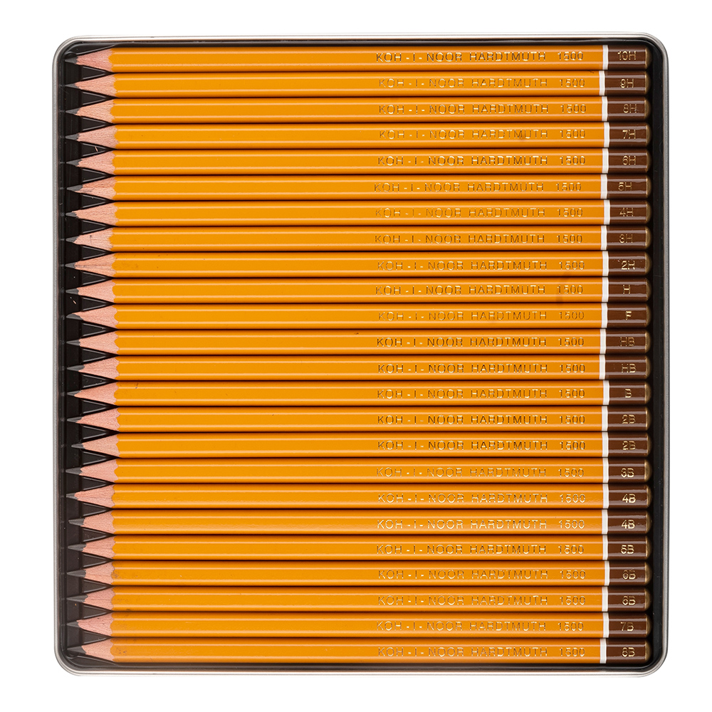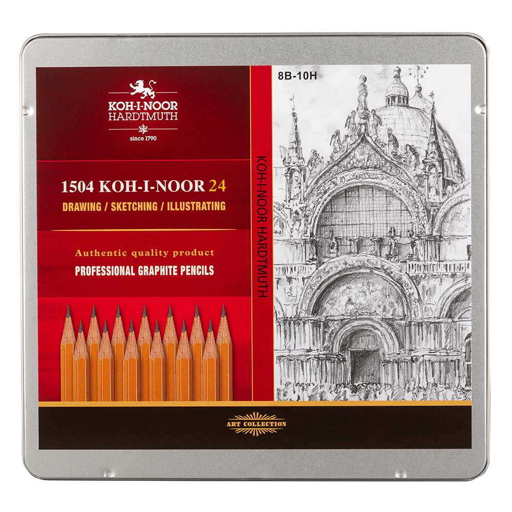 Set of traditional yellow graphite pencils 1504 - 24 pcs of pencils in a metal sheet packaging. The hexagonal graphite pencils in cedar envelope. The graphite lead in 20 classes of hardness 8B - 2H. The classes are exactly observed. The pencils are used for graphic designers and artists. This is the most famous KOH-I-NOOR HARDTMUTH pencil that has been produced for over three centuries.