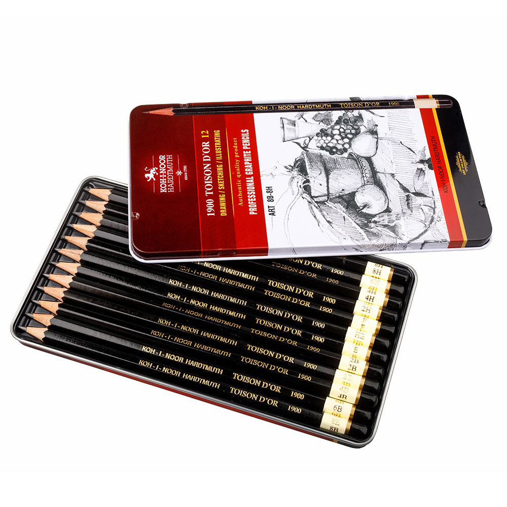 A set of graphite pencils 1902 ART - soft and hard classes. Hexagonal graphite pencils, in black design. Graphite lead in selected 12 classes of hardness 8B - 8H, packaging of 12 pcs in a metal sheet box. The classes are exactly observed. The pencils are used for graphic designers, artists, and technicians.