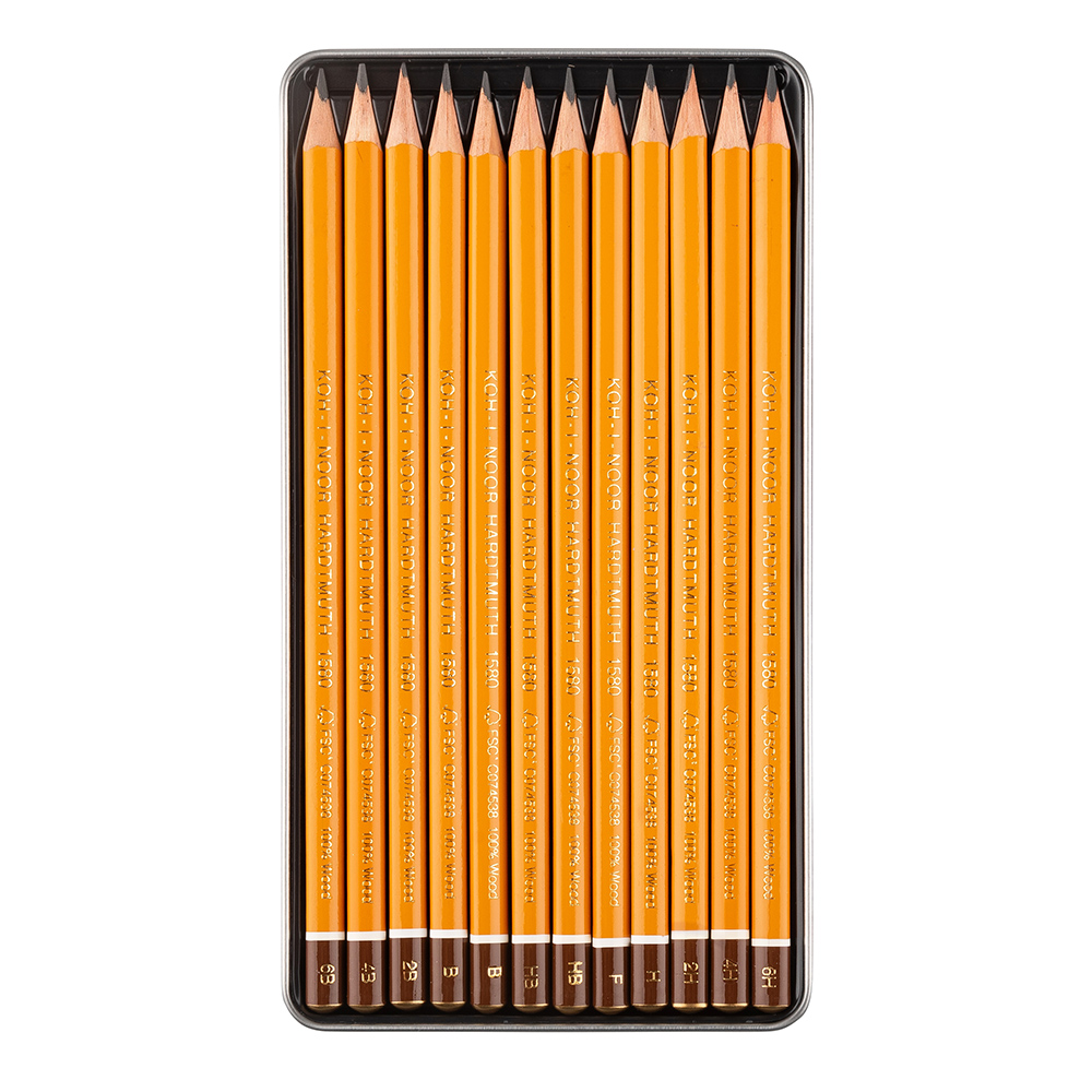 A set of yellow graphite pencils 1582 - 12 pcs of pencils in a metal sheet packaging. Triangle graphite pencils in wooden envelope from certified FSC 100% wood. The graphite lead in 10 classes of hardness 6B - 6H. The classes are exactly observed. Ergonomic triangle shape permits optimum grip and guiding of the pencil. permits optimum grip and guiding of the pencil. Intended not only for pre-school and school kids but also for graphic designers and artists.