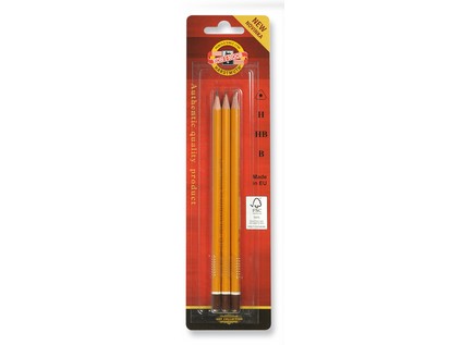 A set of yellow graphite pencils 1580 - 3 pcs of pencils (mix of classes) in a blister pack. Triangle graphite pencils in wooden envelope from certified FSC 100% wood. The graphite lead in three classes of hardness B, H, HB. The classes are exactly observed. Ergonomic triangle shape permits optimum grip and guiding of the pencil. permits optimum grip and guiding of the pencil. Intended not only for pre-school and school kids but also for graphic designers and artists.