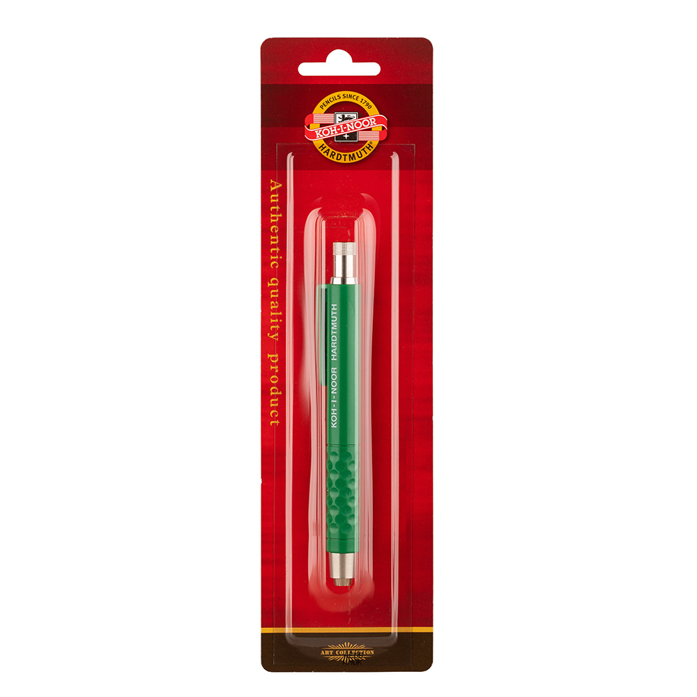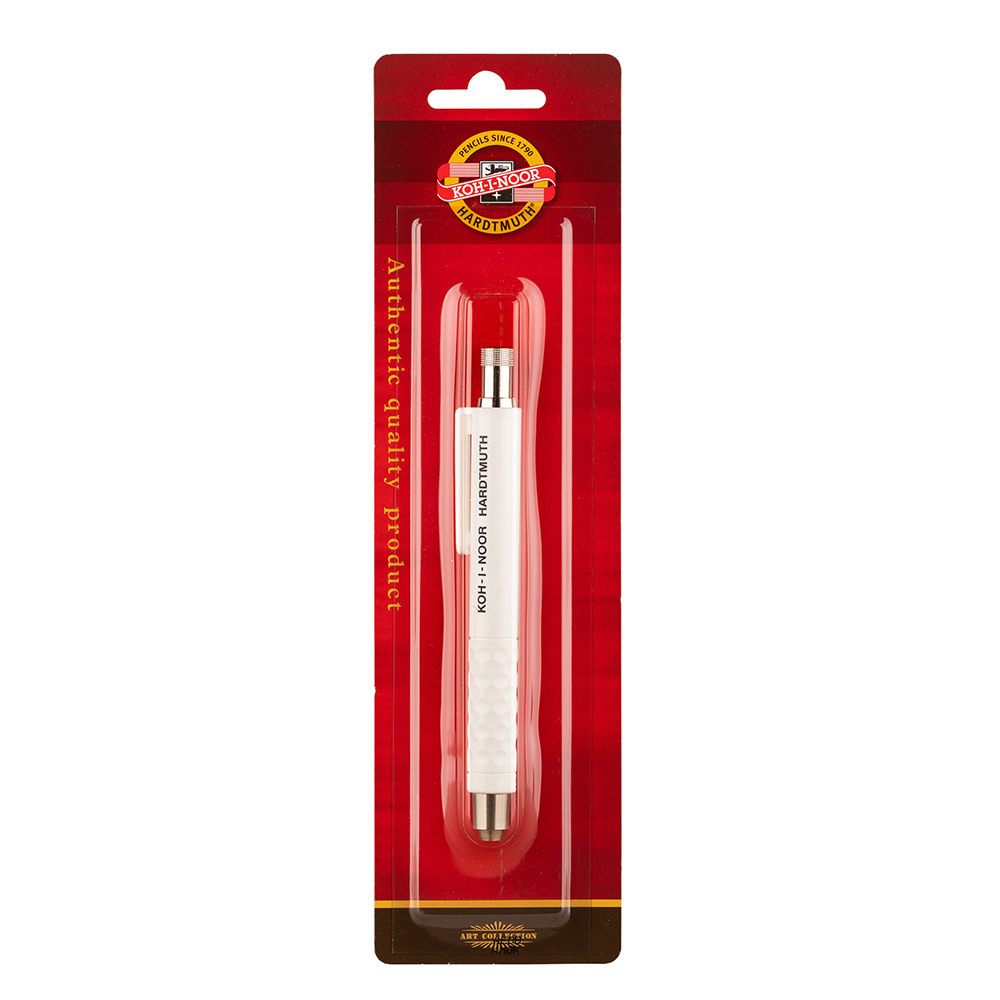 Mechanical propelling pencil, metal-plastic combination, lead diameter 5,6 mm, used for common writing and drawing. The lead is moved by pressing the knob in leaned pencil position, which opens the clamp and the lead is slid out. There is a sharpener in the knob and the lead can be sharpened after screwing the sharpener out. The plastic pencil envelope, round with a clip, metal mechanical parts. Packaging of 1 pc in the blister, 6 colours - yellow, red, black, green, blue, and white. There are 24 pcs of consumer packaging in the blister.