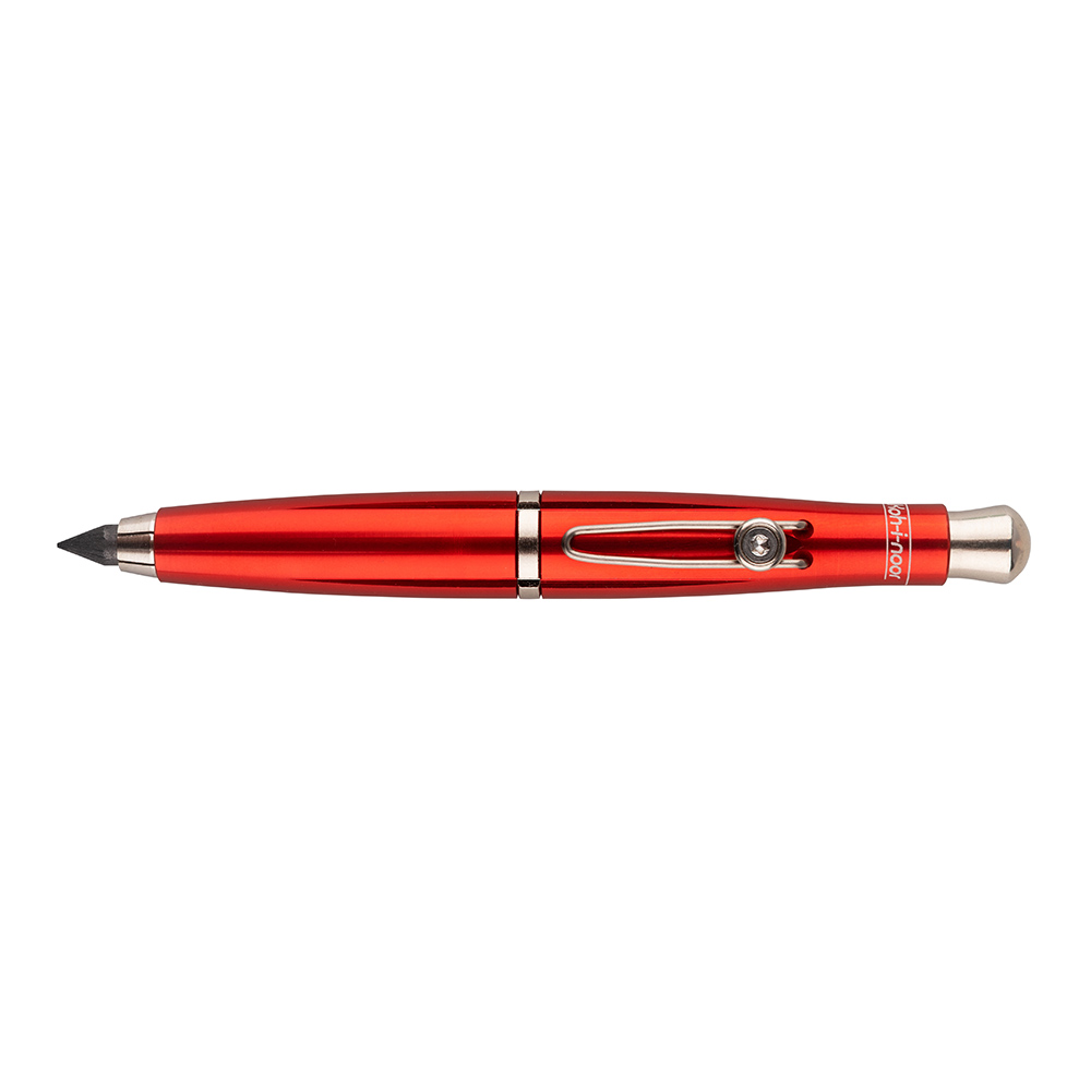 Mechanical propelling pencil, metal, used for common writing and drawing with lead of 5,6 mm in diameter. The lead is moved by pressing the knob in leaned position, which opens the clamp and the lead is slid out as needed. The lead can be sharpened, the knob must be screwed out and the sharpener is inside the knob. The envelope has round profile with 4 longitudinal grooves in red anodic oxidation treatment, components are nickel-coated, wire clip. The pen is inserted in the shaped insert and stored in transparent PET case.
