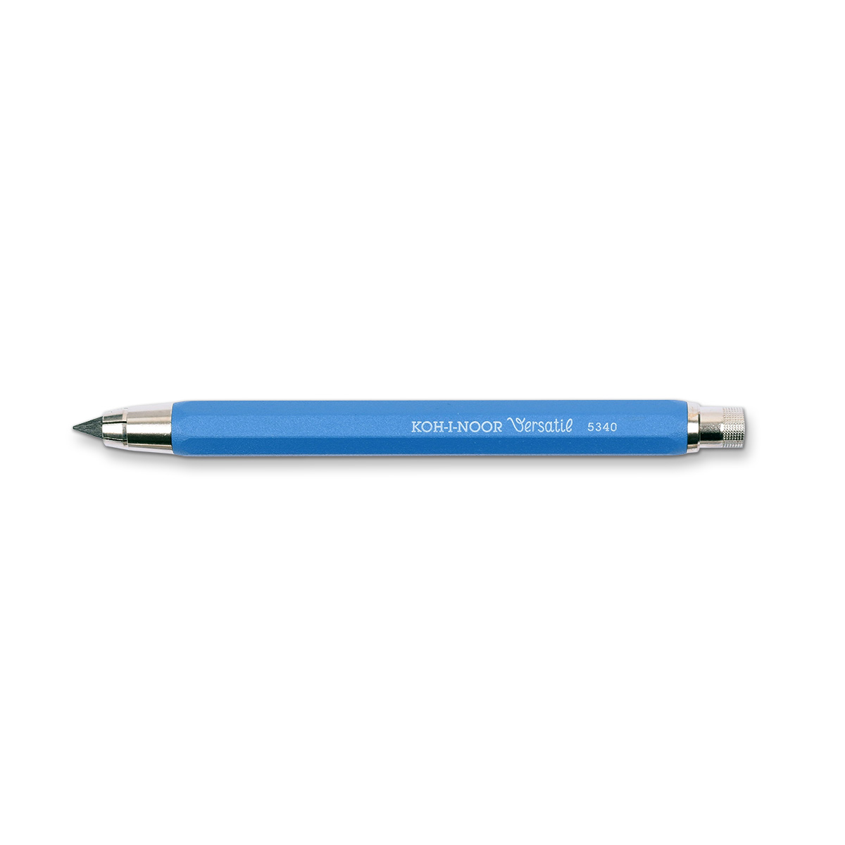 Mechanical propelling pencil, metal, without clip, used for common writing and drawing with lead of 5,6 mm in diameter. The lead is moved by pressing the sharpener knob in leaned pencil position, which opens the clamp and the lead is slid out. The lead can be sharpened and the sharpener is located in the knob that is to be screwed out. Octagonal 0K12 pencil envelope, sprayed with blue colour. A label with EAN code applied on the pencil. Group packing; 20 pencils freely stored and interposed with paper in a cardboard box.