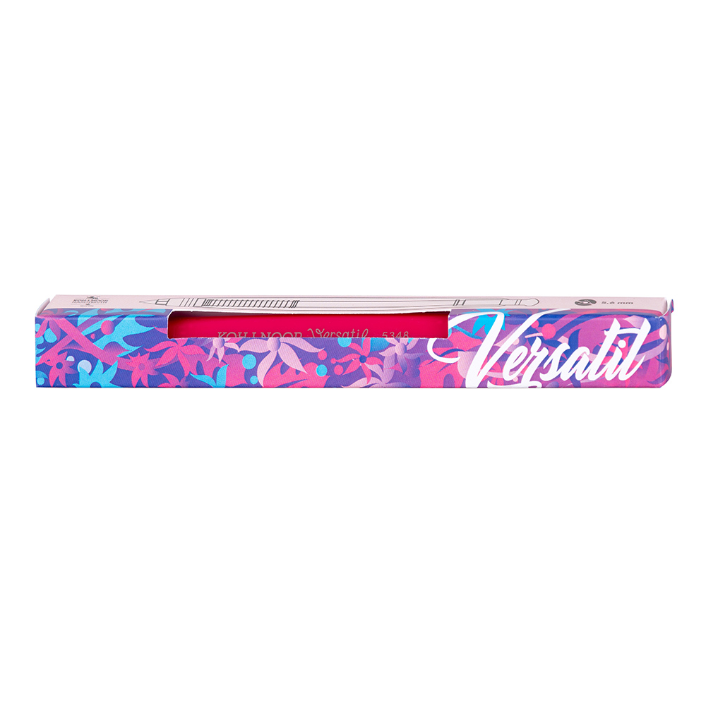 Mechanical dropping pencil with graphite lead 4B with 5,6 mm diameter in combination of metal mechanics - three-side pink plastic profiled coat and visible nickled metal parts. It is designed for everyday writing and drawing. The lead is drawn out by pressing the button while holding the pencil with the tip sloping down. The tongs in the tip open and lead moves out. Inside the button there is a sharpener and after you take the button out you can sharpen the lead. The pencil type number and KOH-I-NOOR Versatil 5348 is printed on the pencil coat in dark silver print. Individual pencils are packed in small paper boxes and specified as EAN1. Sets of pencils are packed by 10 pcs in small carton boxes specified as EAN2.
