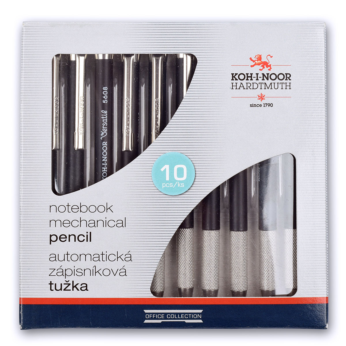 Mechanical notepad pencil, metal-plastic combination, used for common writing and drawing with lead of 2 mm. The lead is moved by pressing the sharpener knob in any pencil position, which opens the clamp and the lead is slid out. There is a sharpener in the knob and the lead can be sharpened after screwing the sharpener out. Metal pencil envelope of round profile, sprayed with black paint, metal mechanical parts nickel-coated, plastic pressing knob. The pencil has metal clip. Group packaging, 10 pcs inserted in the shaped insert and packed in the paper box with printing in school design.