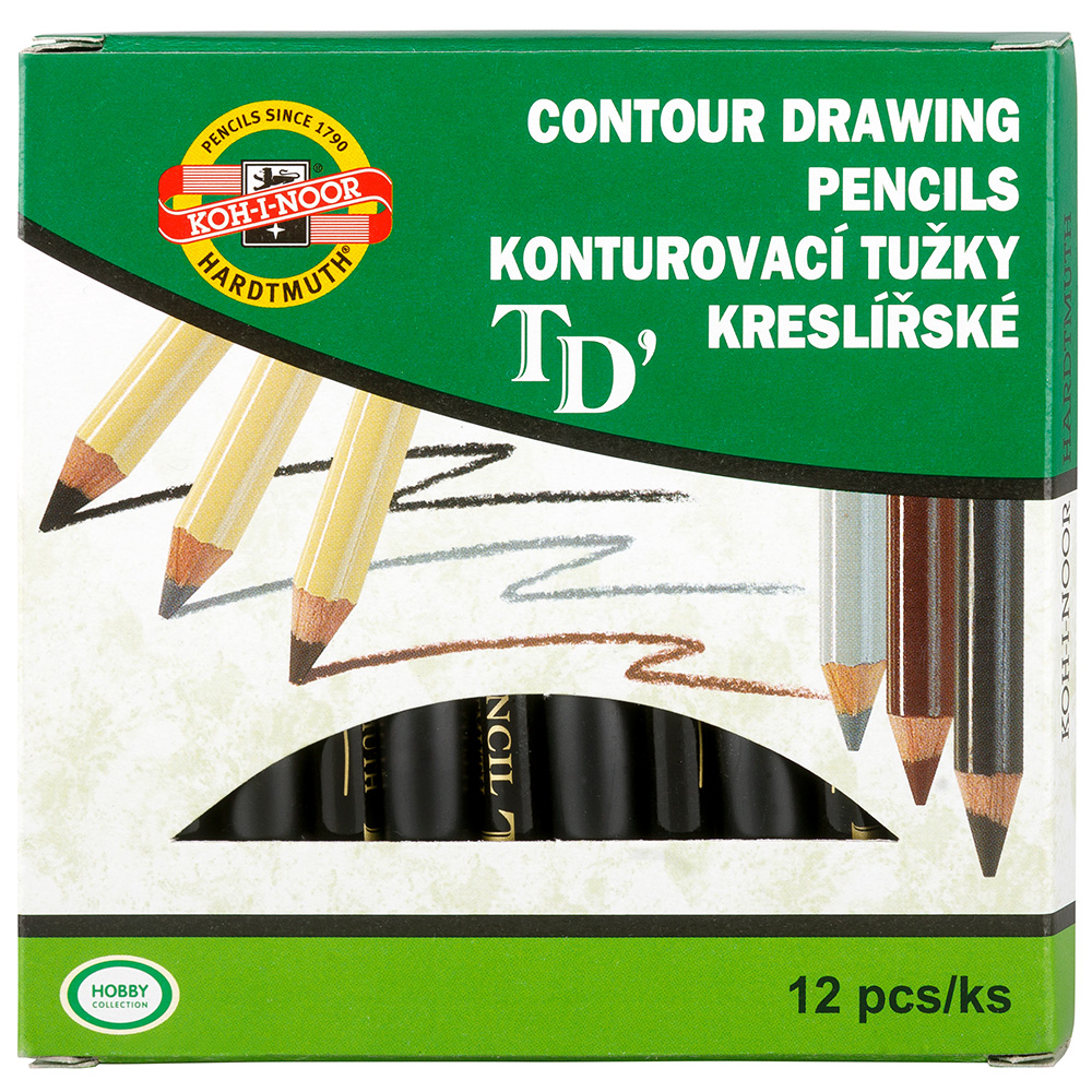 Round contouring pencils for drawers, diameter - 7,5 mm, in wooden envelope, black colour lead. Packaging of 12 pcs of a single colour with tip protector, in cardboard box. Suitable for highlighting of contours.