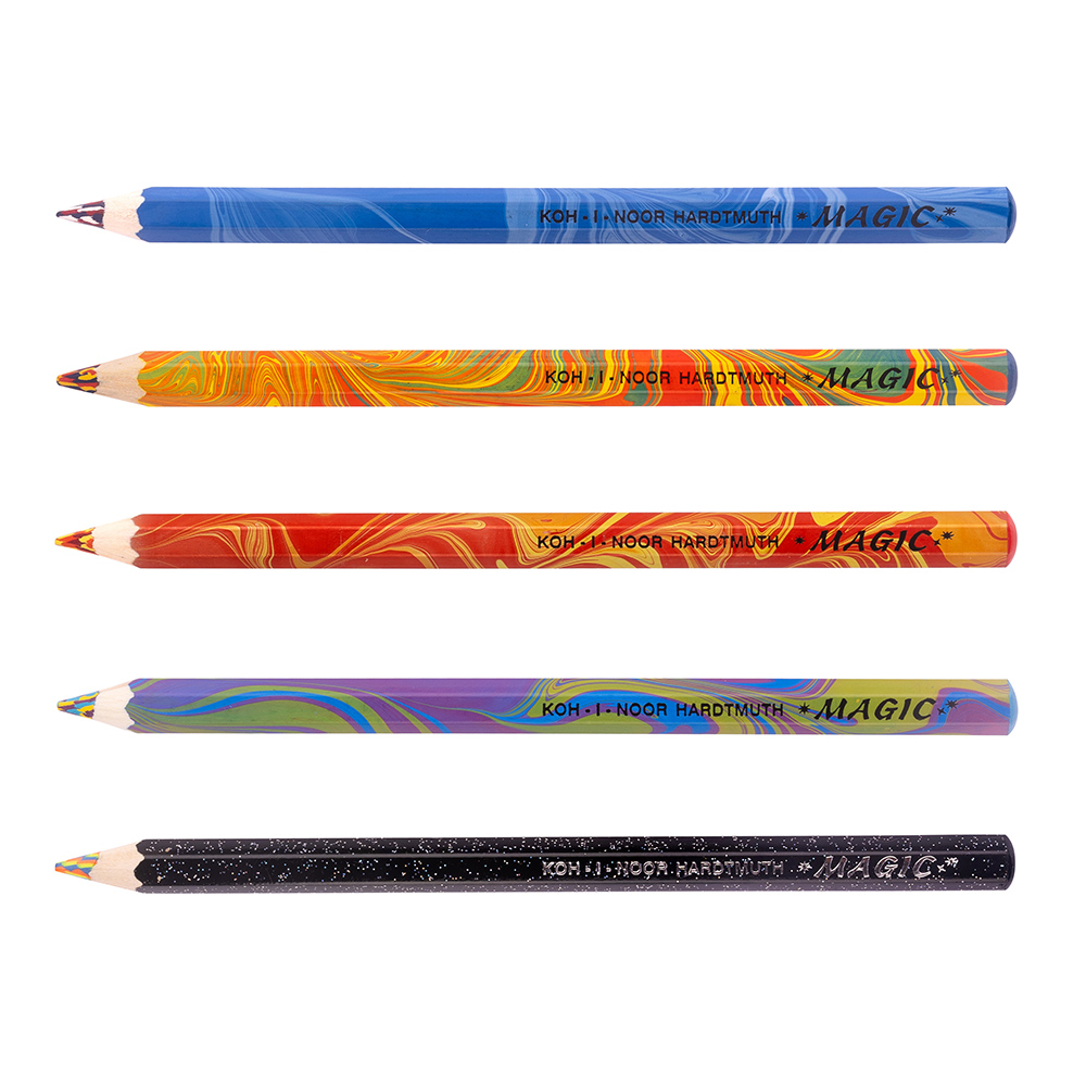 A set of 30 pcs colour pencils MAGIC - (5 types 6 pieces each - Original, Tropical, Fire, Neon, USA blue in a tube). Hexagonal colour pencils MAGIC, in wooden envelope with special tri-colour lead. Magic effect - rainbow colour pencil - 3 colours in a single lead. The pencil creates multi-colour trace that changes by rotating the tip. Intended for school, artistic, or special use.