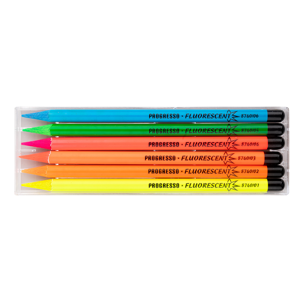 Set of 6 fluorescent coloured pencils, lacquered, with a diameter of 7,6 mm - PROGRESSO. These pencils have clear bright colours and the entire section consists of a drawing lead. When drawing, it leaves a deep and wide mark, it is suitable for drawing on large surfaces. These pencils can be sharpened very easily and are suitable for school, hobby and artistic drawing. Progresso is a traditional and very popular product.