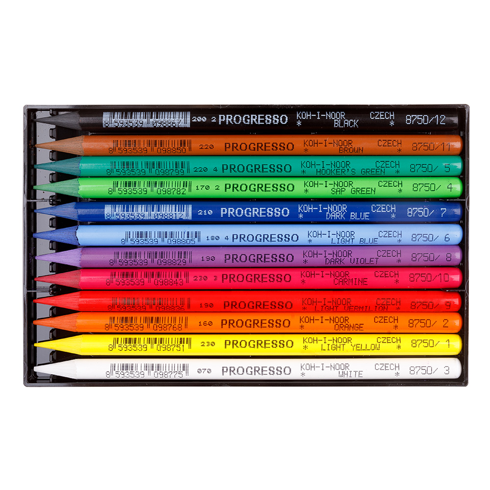 Set 12 coloured pencils, lacquered, (PROGRESSO). Without a wooden envelope, the entire section consists of a pastel lead. These pencils can be sharpened very easily and are suitable for school, hobby and artistic drawing. Due to its section, these pencils are particularly suitable for colouring large areas.