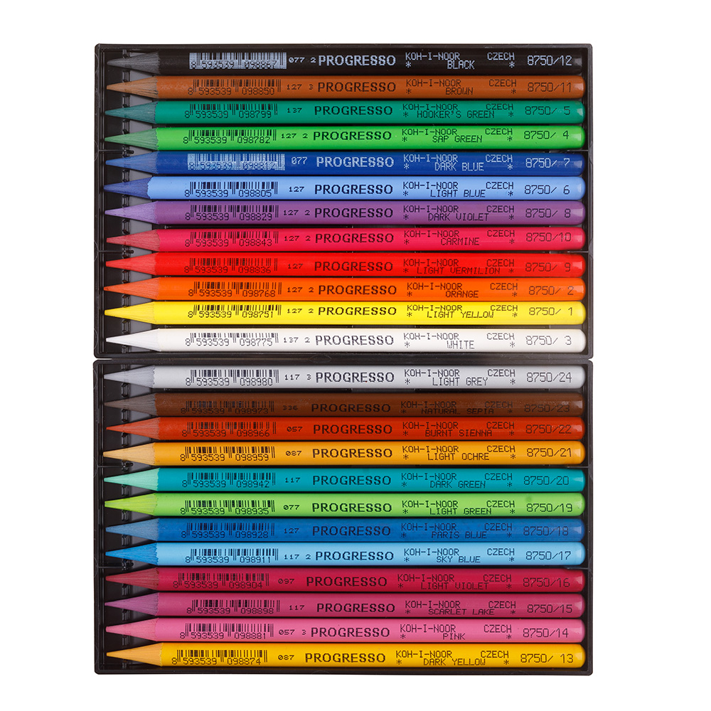 Set 24 coloured pencils, lacquered, (PROGRESSO). Without a wooden envelope, the entire section consists of a pastel lead. These pencils can be sharpened very easily and are suitable for school, hobby and artistic drawing. Due to its section, these pencils are particularly suitable for colouring large areas.