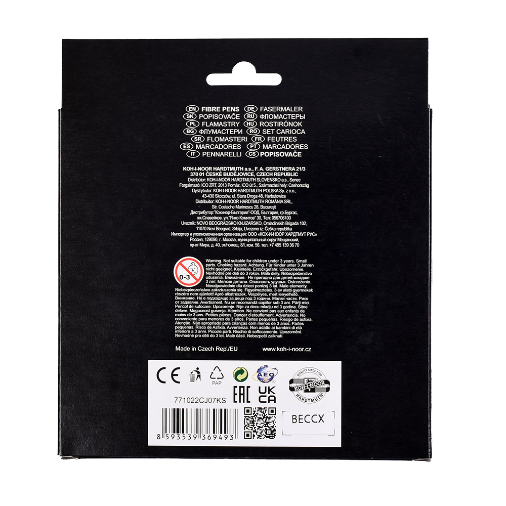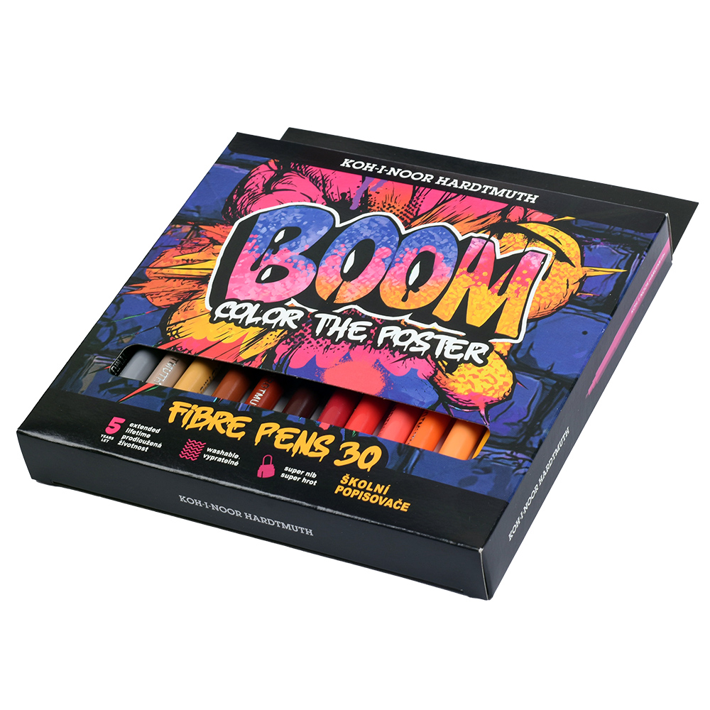 Fibre pens with ergonomic grip. Filled with colourful washable inks in 30 colours and manufactured from materials that provide resistance against drying for at least 5 years. Push-in resistant tips for writing and painting with 1-2 mm trace width and 300 m trace length. All materials used comply with EN-71 standards. Packed in sets of 6, 10, 12, 18, 24, 30 pcs in PP cases.