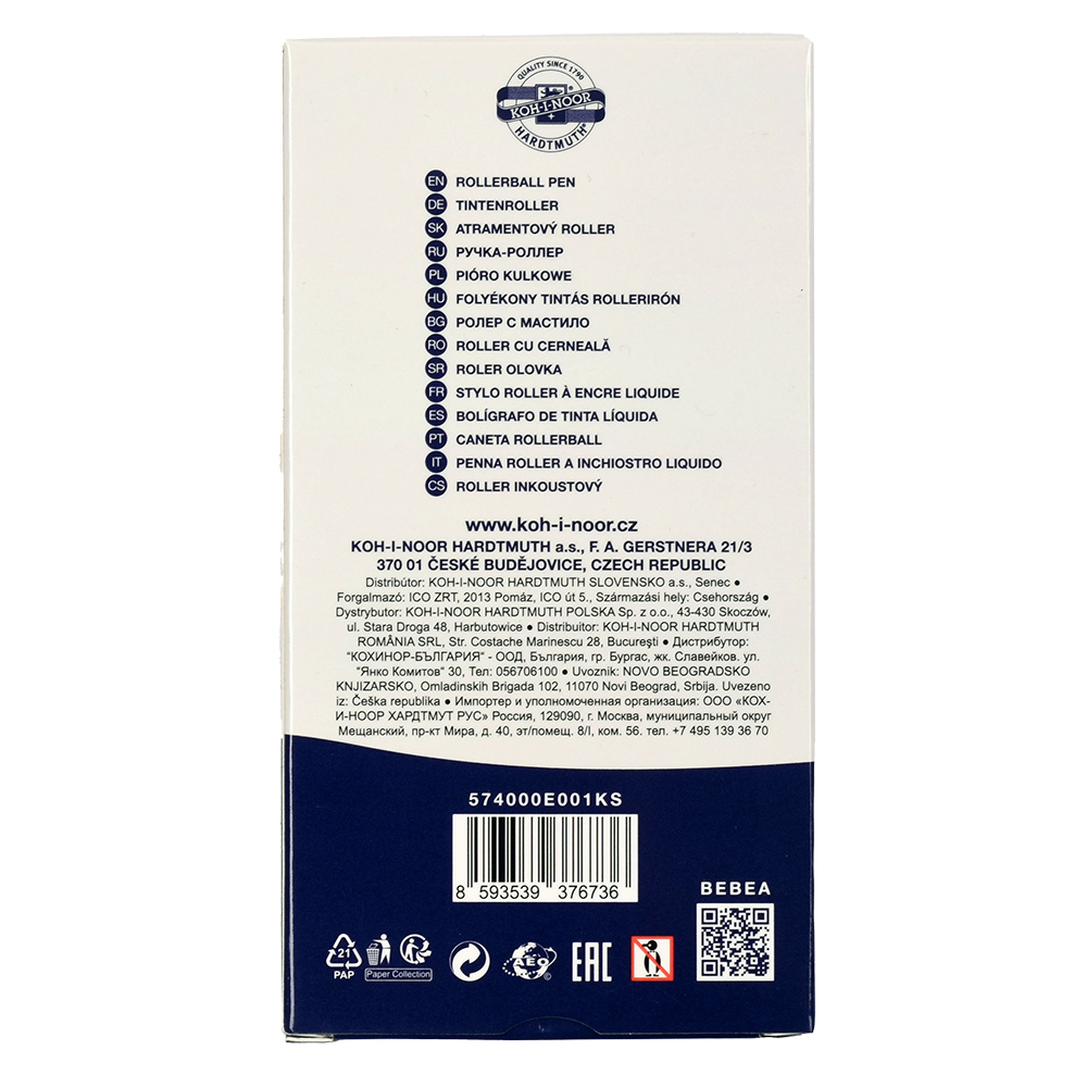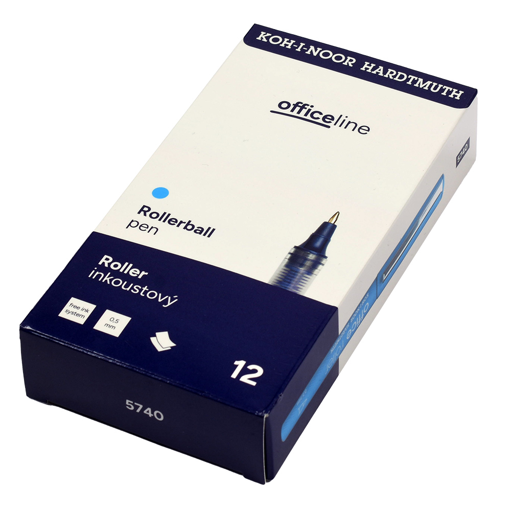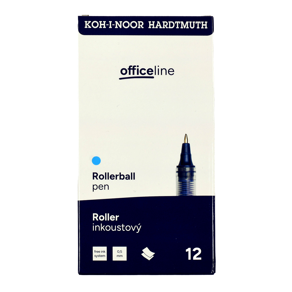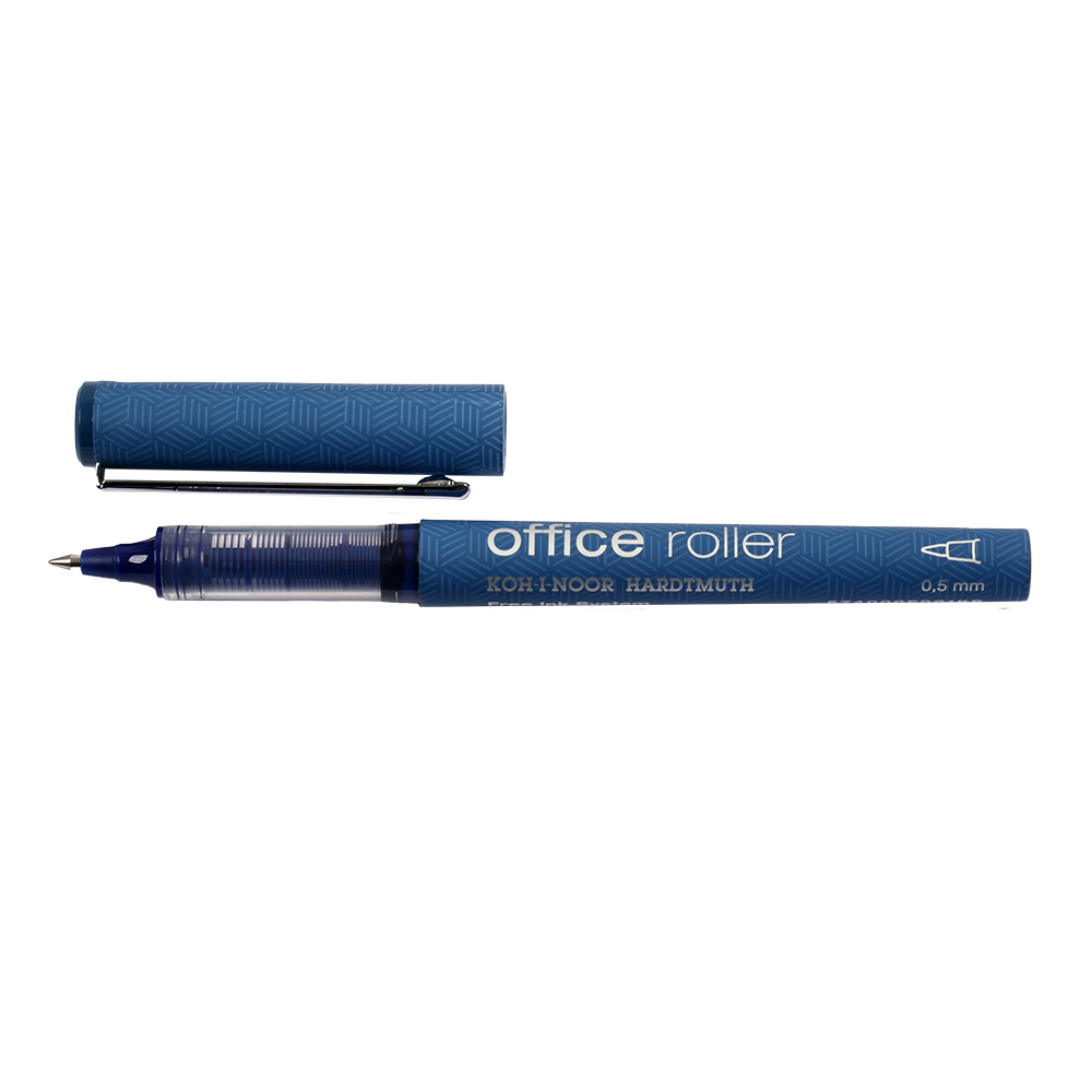 Ink rollerball pen with a metal clip. It has a conical metal ball tip and is filled with blue ink. It provides an even, smooth line width of 0.5 mm and is ideal for everyday writing. Packaged in sets of 12 pieces in paper boxes.