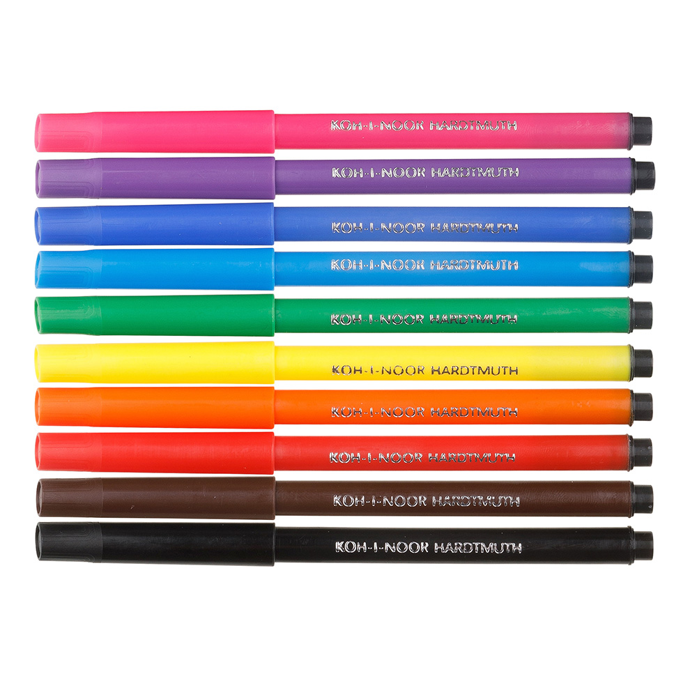 Fibre pens for schools with ergonomic triangle trip and safety protector for breathing if swallowed. Filled with colourful washable inks in 30 colours and manufactured from materials that provide resistance against drying for at least 5 years. Push-in resistant tips for writing and painting with 1-2 mm trace width, 600 m trace length. All materials used comply with EN-71 standards. Packed in sets of 4, 6, 10, 12, 18, 20, 24, 30 pcs in PP cases or cardboard boxes.