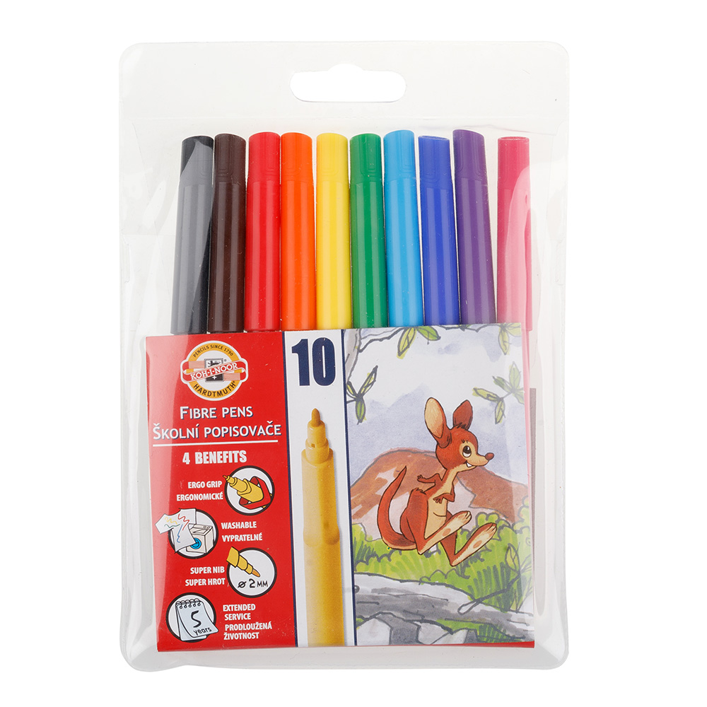 Fibre pens for schools with ergonomic triangle trip and safety protector for breathing if swallowed. Filled with colourful washable inks in 30 colours and manufactured from materials that provide resistance against drying for at least 5 years. Push-in resistant tips for writing and painting with 1-2 mm trace width, 600 m trace length. All materials used comply with EN-71 standards. Packed in sets of 4, 6, 10, 12, 18, 20, 24, 30 pcs in PP cases or cardboard boxes.