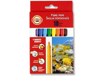 Fibre pens for schools with ergonomic triangle trip and safety protector for breathing if swallowed. Filled with colourful washable inks in 30 colours and manufactured from materials that provide resistance against drying for at least 5 years. Push-in resistant tips for writing and painting with 1-2 mm trace width, 600 m trace length. All materials used comply with EN-71 standards. Packed in sets of 4, 6, 10, 12, 18, 20, 24, 30 pcs in PP cases or cardboard boxes.