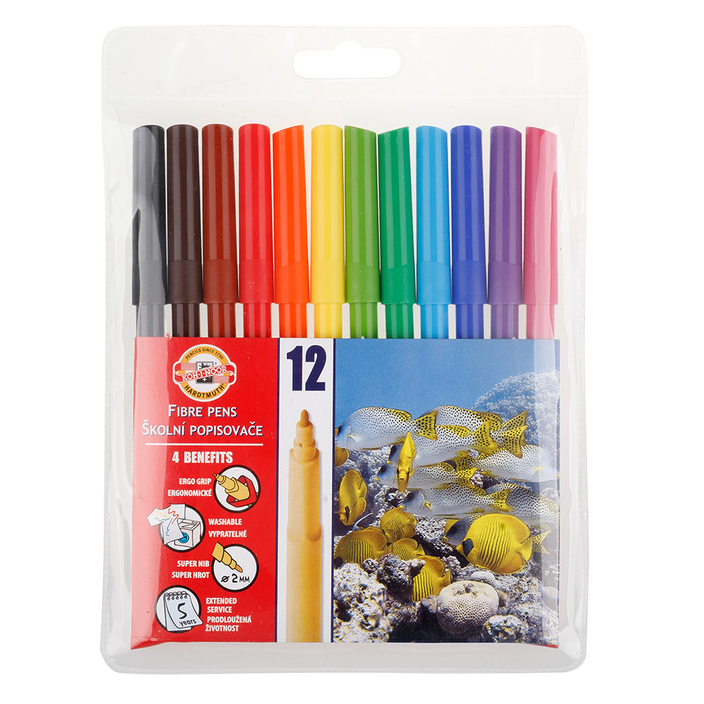 Fibre pens for schools with ergonomic triangle trip and safety protector for breathing if swallowed. Filled with colourful washable inks in 30 colours and manufactured from materials that provide resistance against drying for at least 5 years. Push-in resistant tips for writing and painting with 1-2 mm trace width, 600 m trace length. All materials used comply with EN-71 standards. Packed in sets of 4, 6, 10, 12, 18, 20, 24, 30 pcs in PP cases or cardboard boxes.
