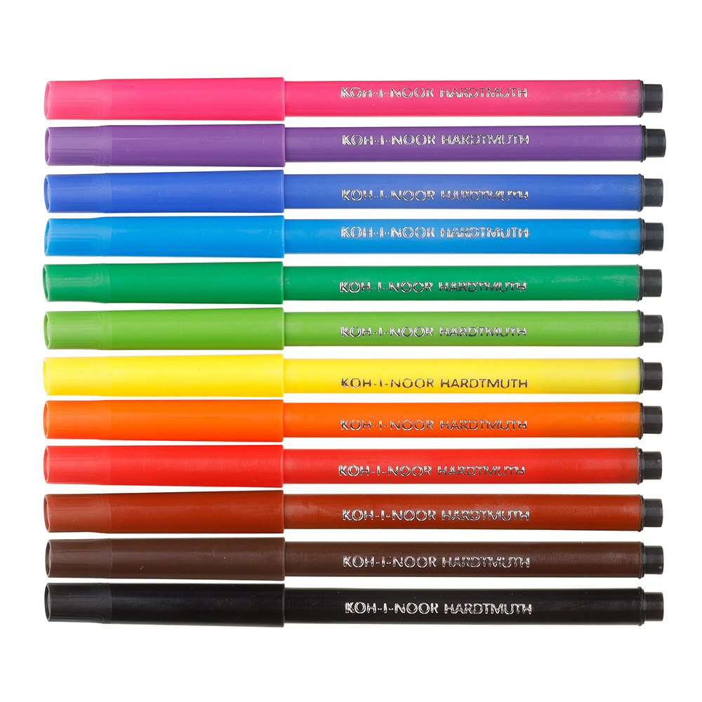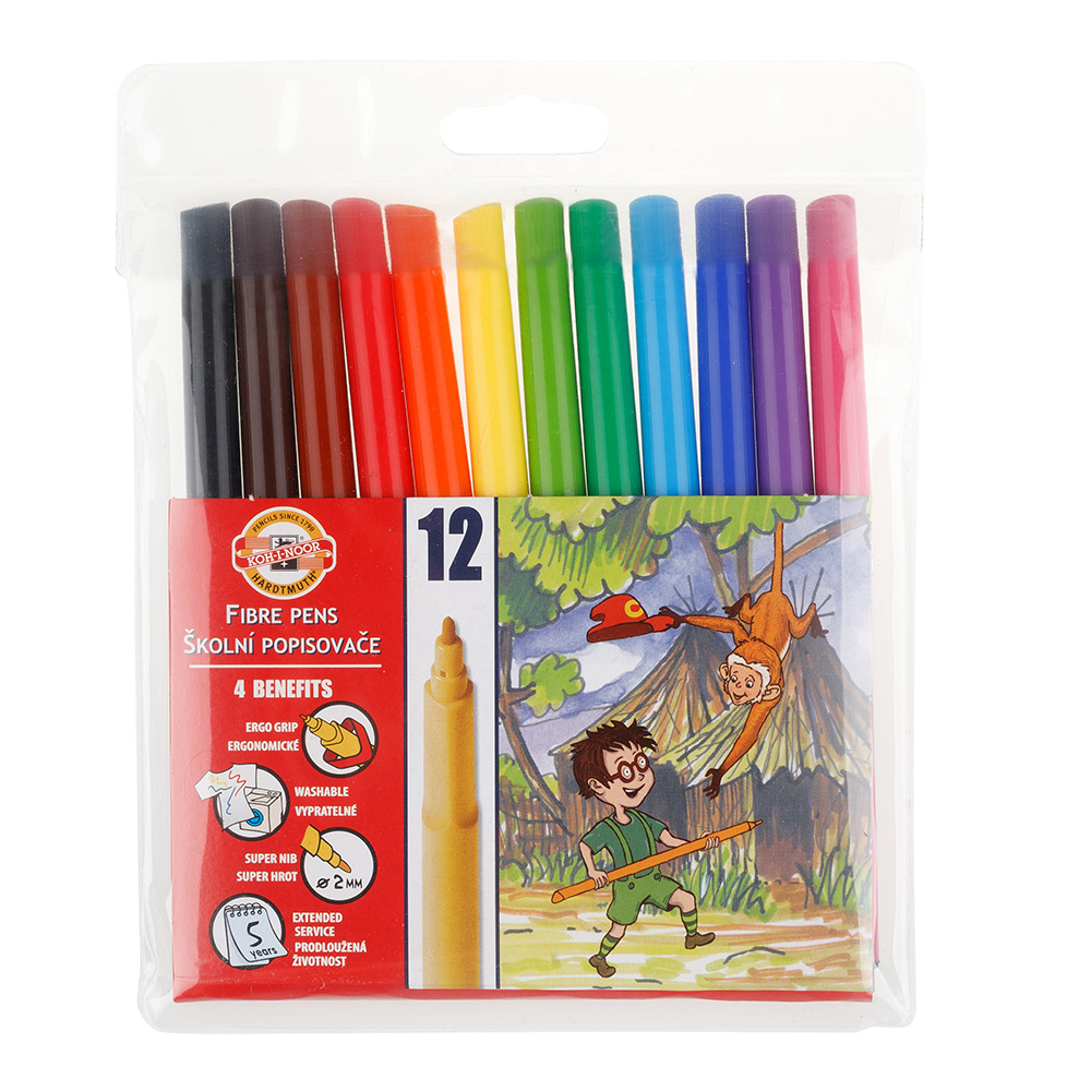 Fibre pens for schools with ergonomic triangle trip and safety protector for breathing if swallowed. Filled with colourful washable inks in 30 colours and manufactured from materials that provide resistance against drying for at least 5 years. Push-in resistant tips for writing and painting with 1-2 mm trace width, 600 m trace length. All materials used comply with EN-71 standards. Packed in sets of 4, 6, 10, 12, 18, 20, 24, 30 pcs in PP cases or cardboard boxes.