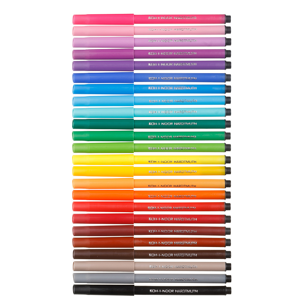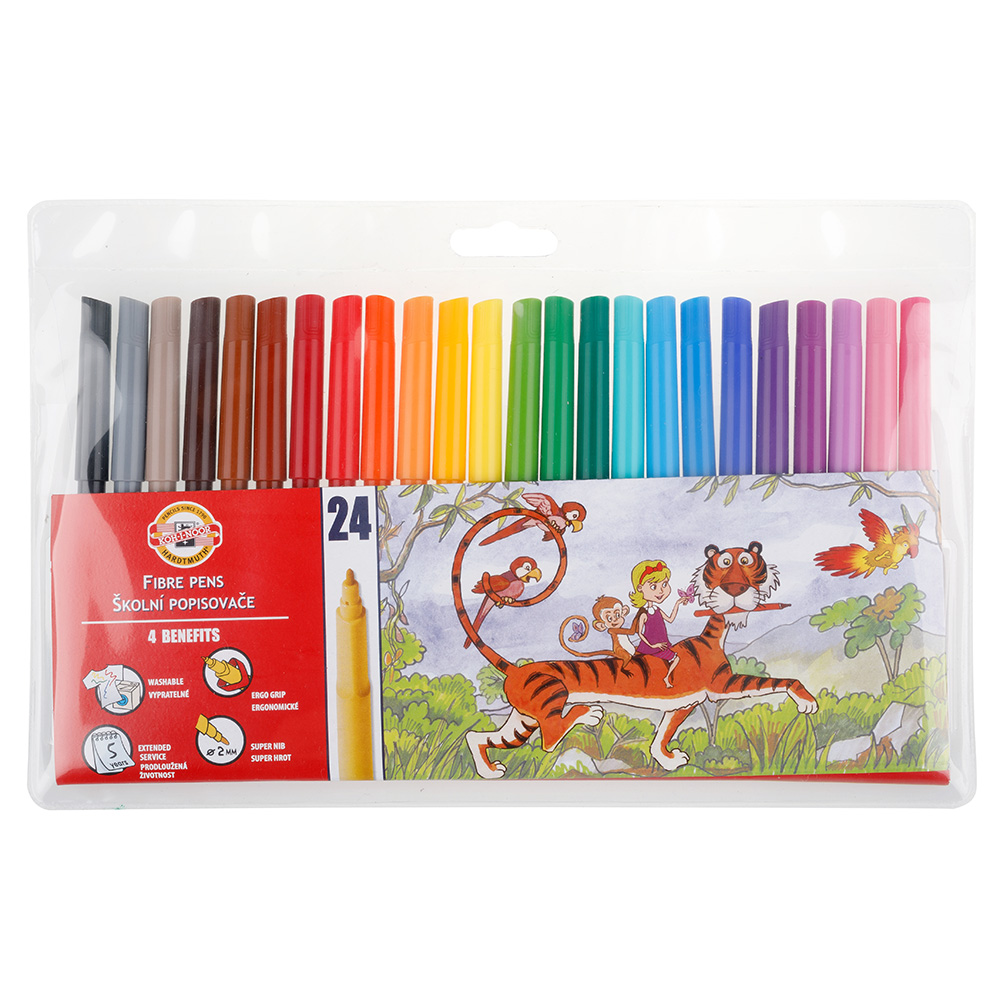 Fibre pens for schools with ergonomic triangle trip and safety protector for breathing if swallowed. Filled with colourful washable inks in 30 colours and manufactured from materials that provide resistance against drying for at least 5 years. Push-in resistant tips for writing and painting with 1-2 mm trace width, 600 m trace length. All materials used comply with EN-71 standards. Packed in sets of 4, 6, 10, 12, 18, 20, 24, 30 pcs in PP cases or cardboard boxes.