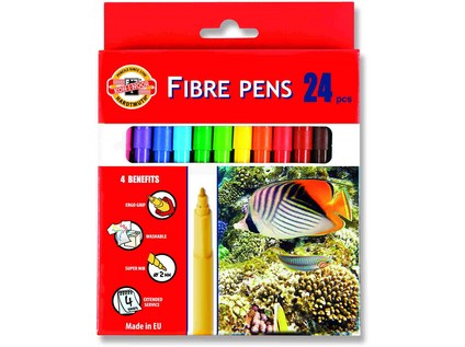 Fibre pens for schools with ergonomic triangle trip and safety protector for breathing if swallowed. Filled with colourful washable inks in 30 colours and manufactured from materials that provide resistance against drying for at least 5 years. Push-in resistant tips for writing and painting with 1-2 mm trace width, 600 m trace length. All materials used comply with EN-71 standards. Packed in sets of 4, 6, 10, 12, 18, 20, 24, 30 pcs in PP cases or cardboard boxes.