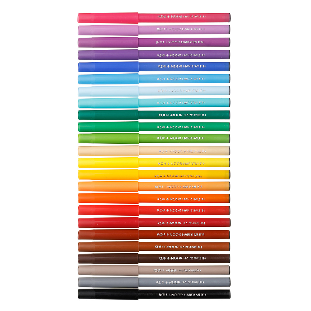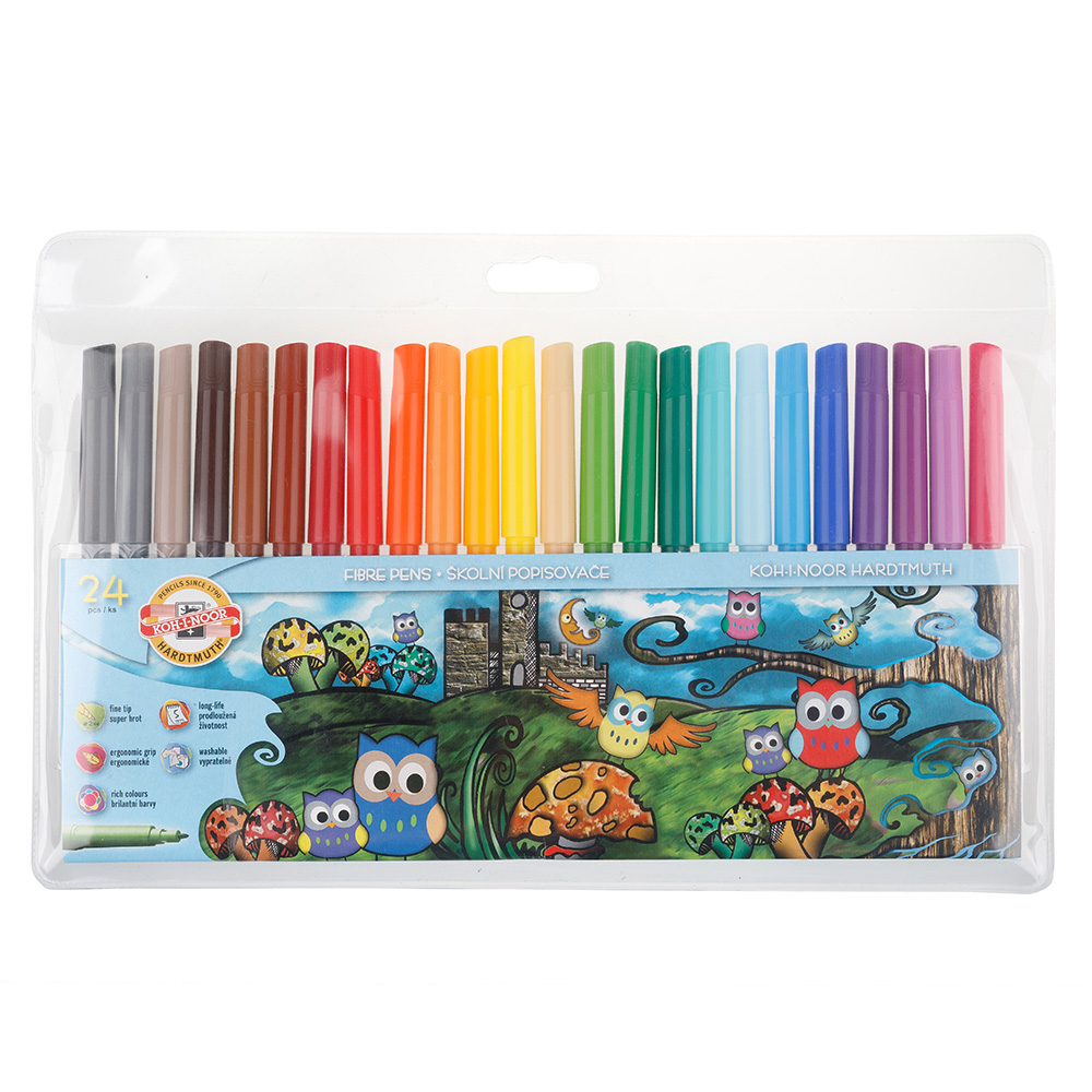 Fibre pens for schools with ergonomic triangle trip and safety protector for breathing if swallowed. Filled with colourful washable inks in 30 colours and manufactured from materials that provide resistance against drying for at least 5 years. Push-in resistant tips for writing and painting with 1-2 mm trace width, 600 m trace length. All materials used comply with EN-71 standards. Packed in sets of 6, 10, 12, 18, 24, 30 pcs in PP cases or cardboard boxes.