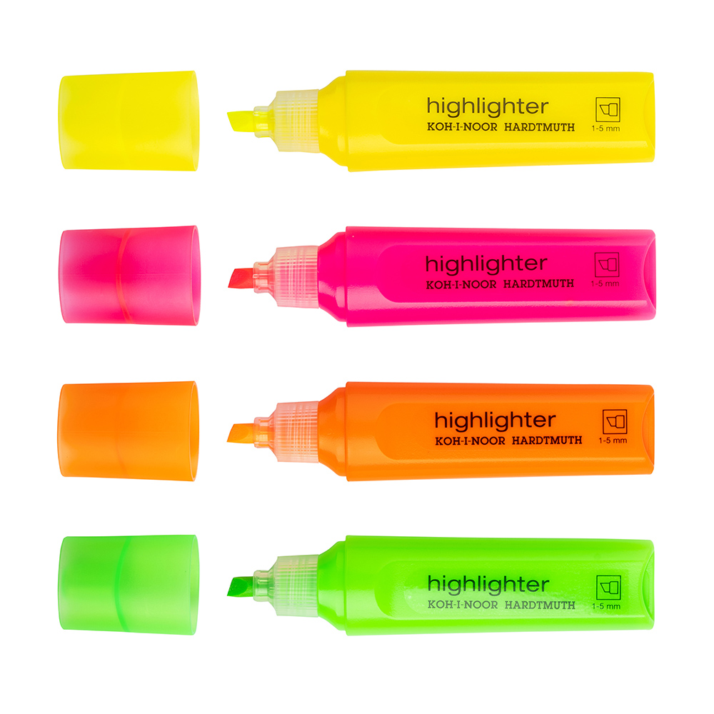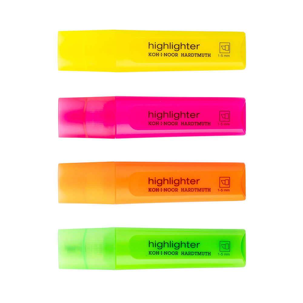 Set of 4 highlighters: yellow, orange, pink and green. 4,8 mm wide chisel tip is resistant against pushing in. Width of the colour trace is 1 – 5 mm. Ink is water based in yellow colour. Washable, does not bleed through the paper. Plastic casing of the highlighter including a cap is in ink colour.