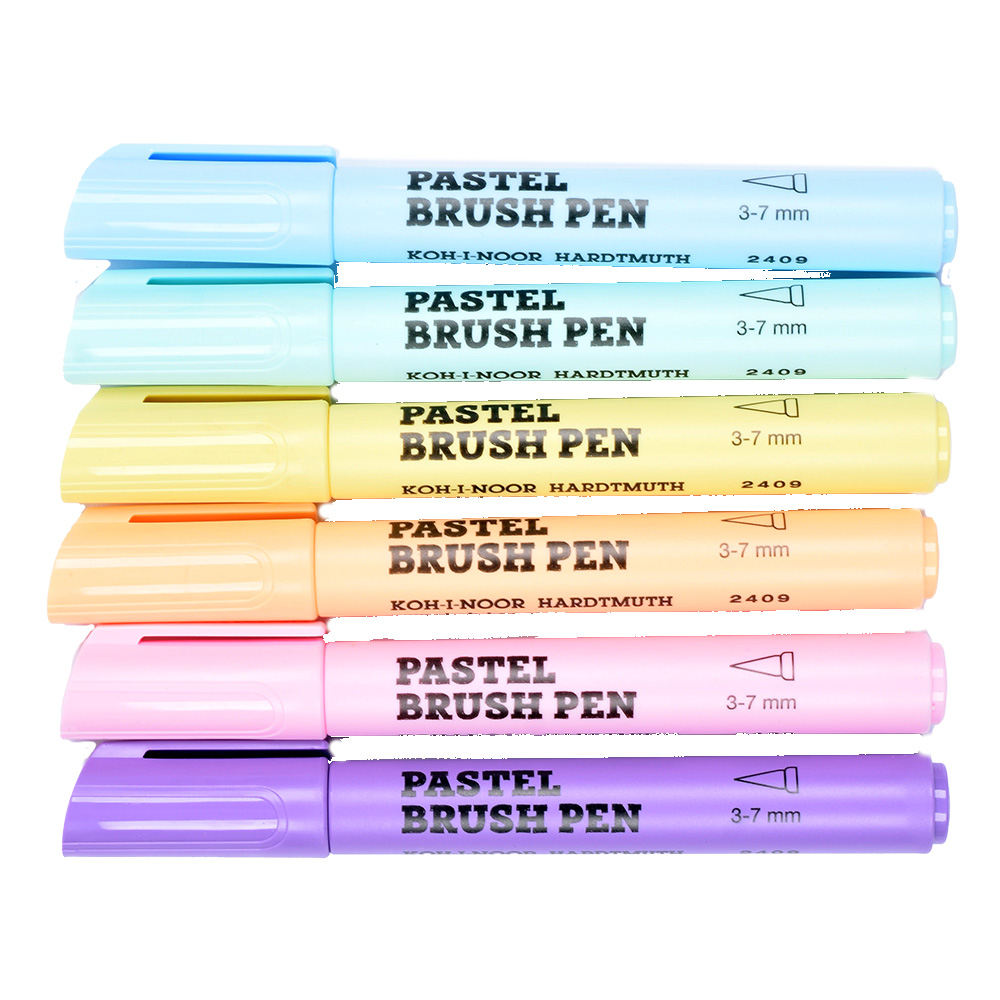 The brush pens are filled with inks in 6 pastel shades and are made from materials that ensure drying-out resistance for 3 years as a minimum. The product is used for creative writing and painting on all types of paper. They are fitted with a flexible brush tip that allows writing with a 3–7 mm colour trace. Packed in paper boxes 6 pieces.