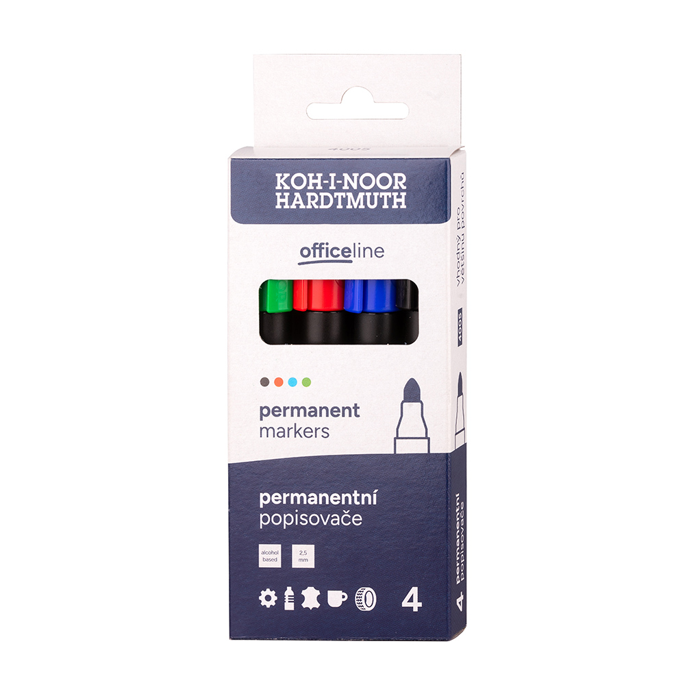 Permanent markers filled with alcohol-based inks, red, blue, green, and black colour. The trace width is abrasion, water, and weather resistant. Can be used for most surfaces: particularly for writing on non-porous materials such as metals, glass, china, plastics, leather, wood, concrete and stone, cardboard, paperboard. If needed, alcohol can be used to remove the marks from non-porous materials. Fitted with round tips of 5 mm in diameter with 2,5 mm trace width and 600 m trace length. Packed in paper boxes, 10 pcs of each colour or in sets of 4 pieces in paper boxes.