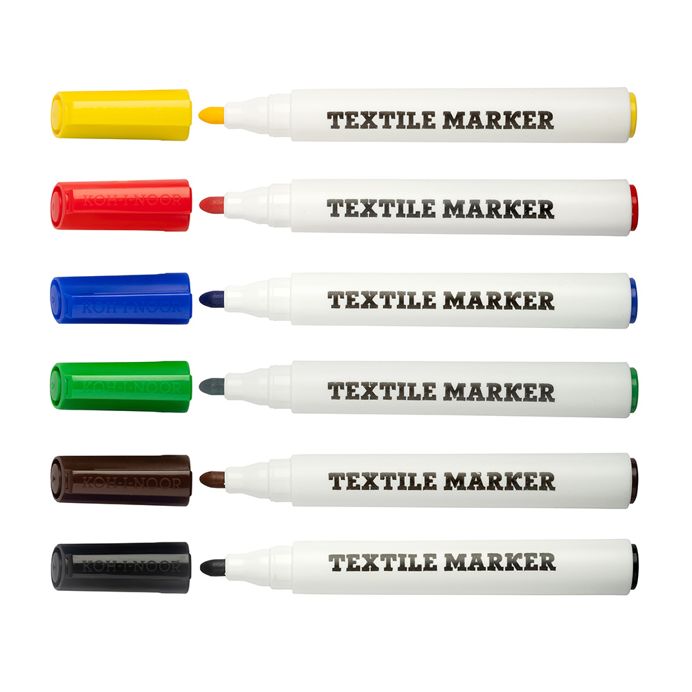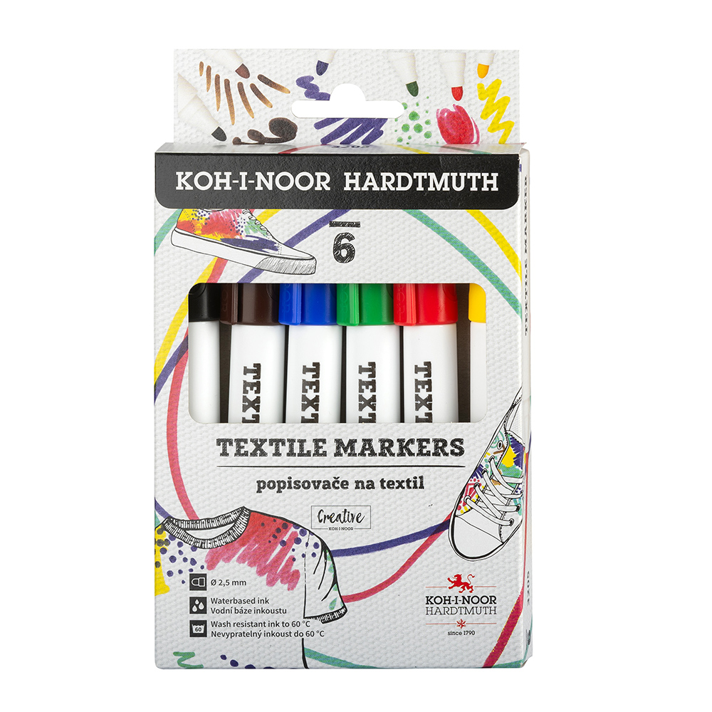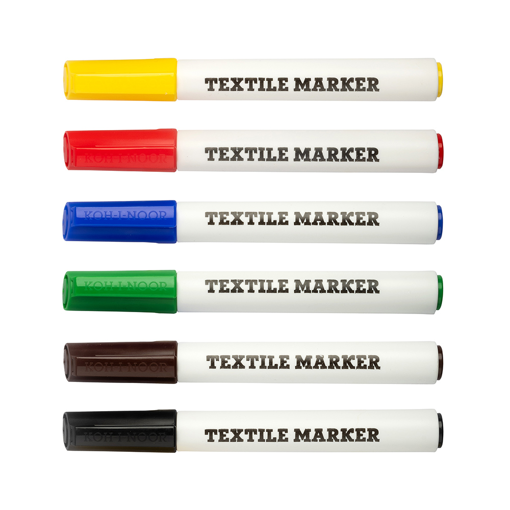 The markers are filled with water-based inks in 6 colours. Intended for writing and painting on fabric materials. The trace is resistant to repeated normal washing in washing machines and it light-fast. Suitable also for various types of paper. Fitted with round tips of 5 mm in diameter with 2,5 mm trace width and 400 m trace length. All materials used provide at least three-year lifespan. They are packed 10 pieces of one colour in paper box or as a set of 4 and 6 assorted colours in paper boxes.