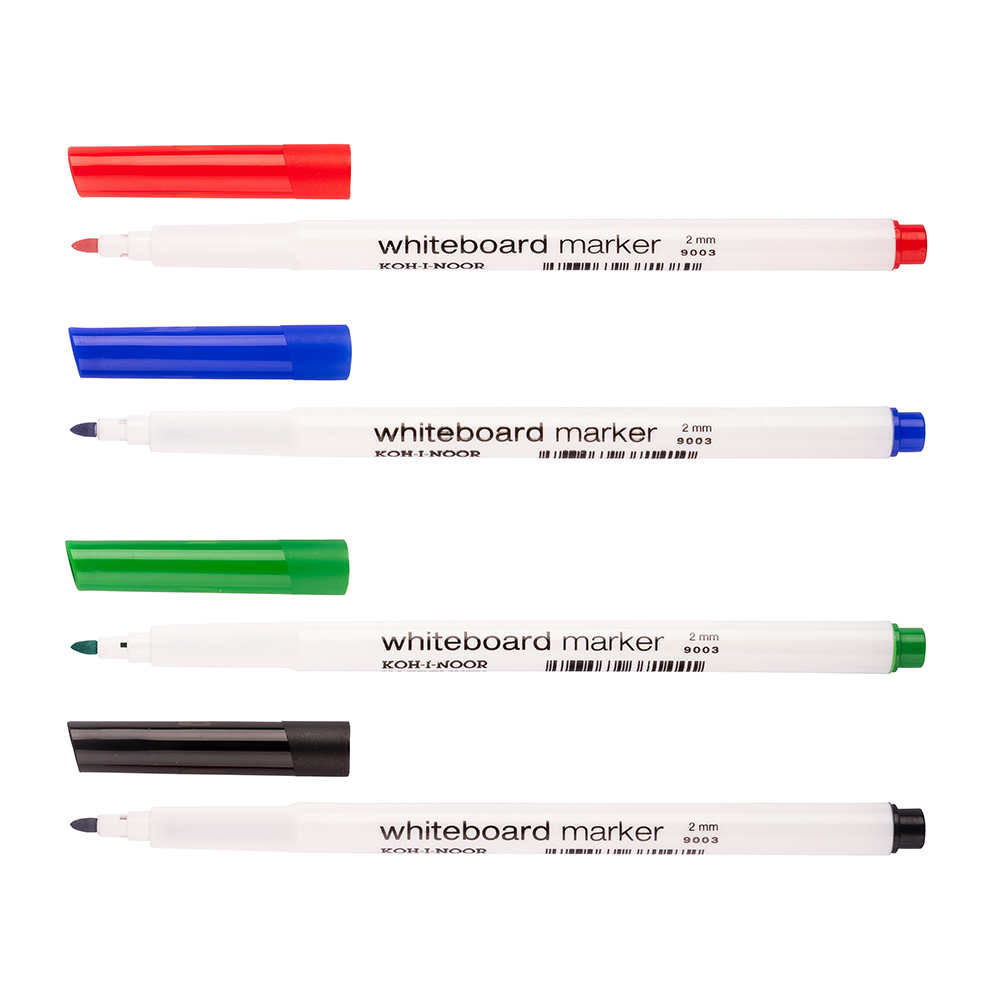 White board markers, filled with pigmented dry-wiped alcohol-based inks, red, blue, green, and black colour. Trace can be dry wiped. Intended for writing on non-porous white boards in schools and offices, particularly for wipeable tables of smaller dimensions. When used on paper the trace is light-fast. Round tips allow writing 2 mm trace width and 350 m trace length. Packed in paper boxes, 10 pcs of each colour or in sets of 4 pieces in paper boxes. Long-term storage in horizontal position is required.