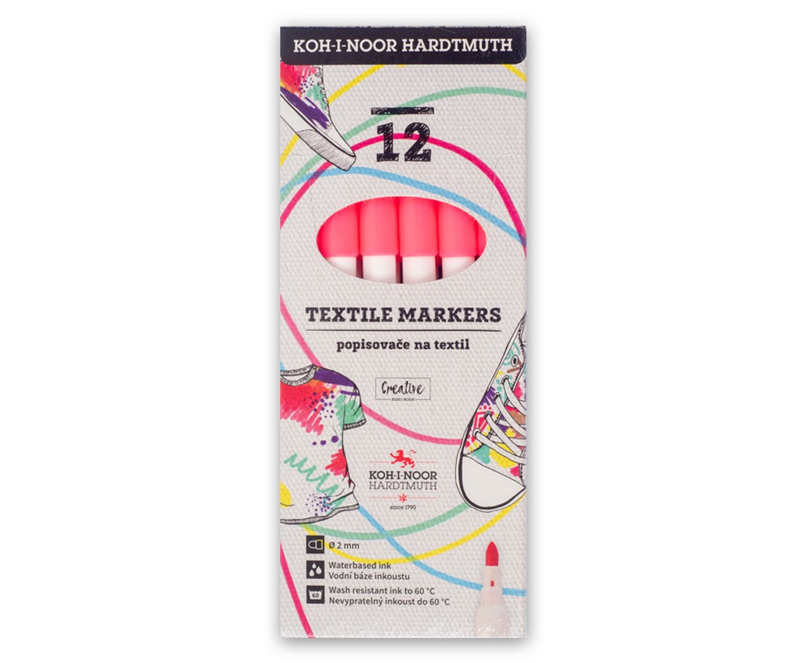 The markers are filled with water-based inks in 8 basic and 4 fluorescent colours. Intended for writing and painting on fabric materials. The trace is resistant to repeated normal washing in washing machines and it light-fast. Suitable also for various types of paper. Fitted with round tips of 3 mm in diameter with 2 mm trace width and 500 m trace length. All materials used comply with EN-71 standards and provide at least two-year lifecycle. They are packed in cardboard boxes, 12 pieces of each colour, 4 pieces in paper boxes, or 1 piece in PP bag.