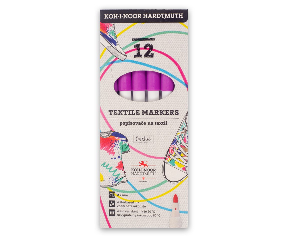 The markers are filled with water-based inks in 8 basic and 4 fluorescent colours. Intended for writing and painting on fabric materials. The trace is resistant to repeated normal washing in washing machines and it light-fast. Suitable also for various types of paper. Fitted with round tips of 3 mm in diameter with 2 mm trace width and 500 m trace length. All materials used comply with EN-71 standards and provide at least two-year lifecycle. They are packed in cardboard boxes, 12 pieces of each colour, 4 pieces in paper boxes, or 1 piece in PP bag.