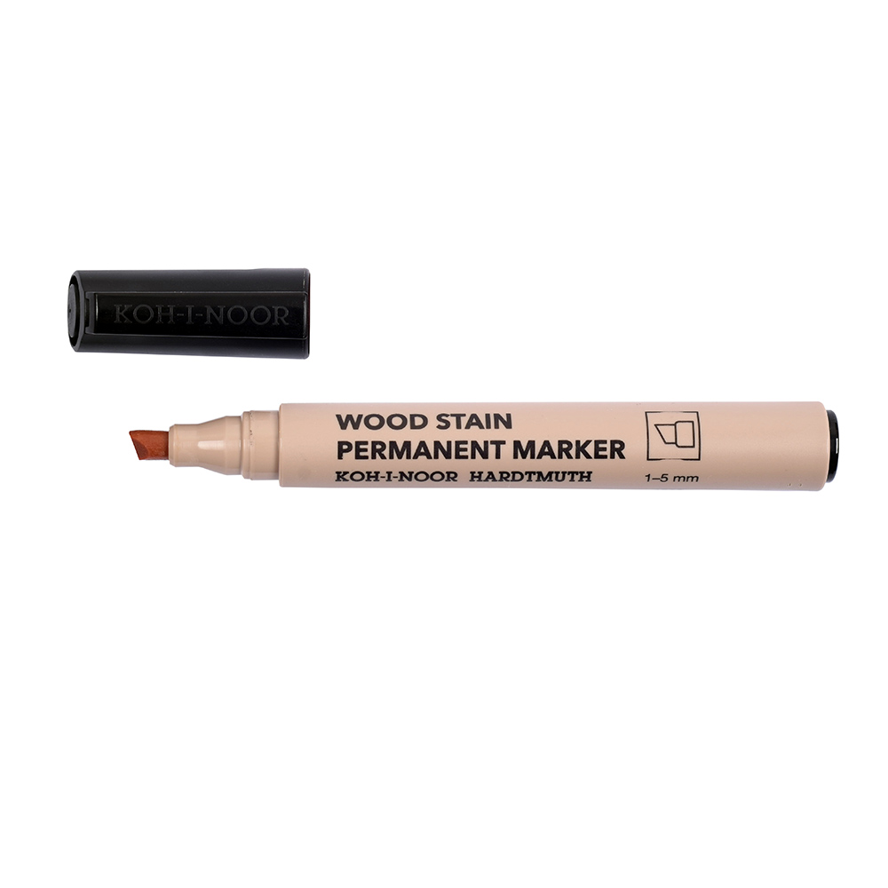 Fibre pens filled with alcohol-based inks in wood colours. The trace width is abrasion, water, and weather resistant, and light-fast. They are used for colouring and repairs of minor surfaces of wood, furniture, floors, and similar materials. If needed, the trace can be removed by alcohol from non-porous materials. Fitted with wedge-shaped tips of 5 mm in diameter with 1- 5 mm trace width and 400 m trace length. Packed in paper boxes, 10 pcs of each colour or in sets of 6 pieces.