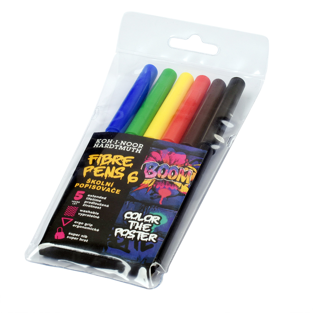 Fibre pens with ergonomic grip. Filled with colourful washable inks in 6 colours and manufactured from materials that provide resistance against drying for at least 5 years. Push-in resistant tips for writing and painting with 1-2 mm trace width and 300 m trace length. All materials used comply with EN-71 standards. Packed in sets of 6, 10, 12, 18, 24, 30 pcs in PP cases.