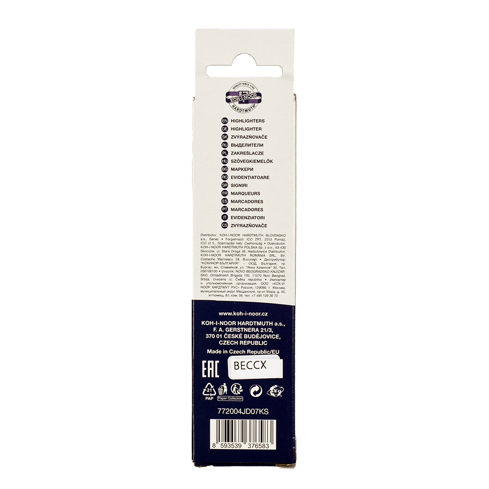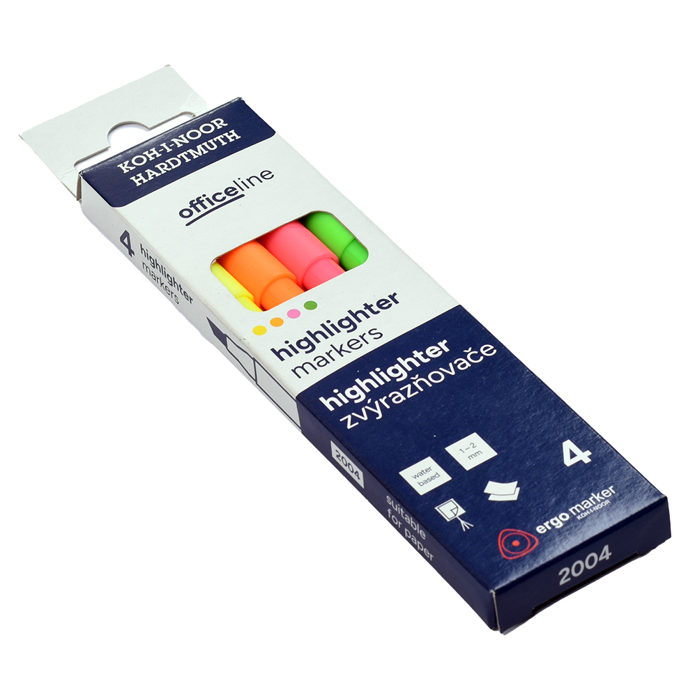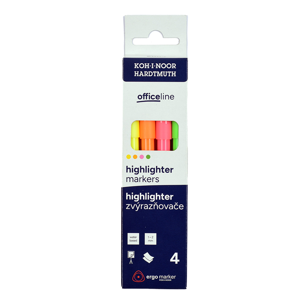 Highlighters are filled with colorful pigment inks in 4 shades and made from materials that ensure resistance to drying out for at least 3 years. They are designed for highlighting text on all types of paper. The wedge tips are resistant to pressure, with a line width of 1–2 mm and a line length of up to 200 m. The highlighters are designed with maximum safety in mind – a special cap allows breathing even if swallowed. They are packaged in paper boxes.