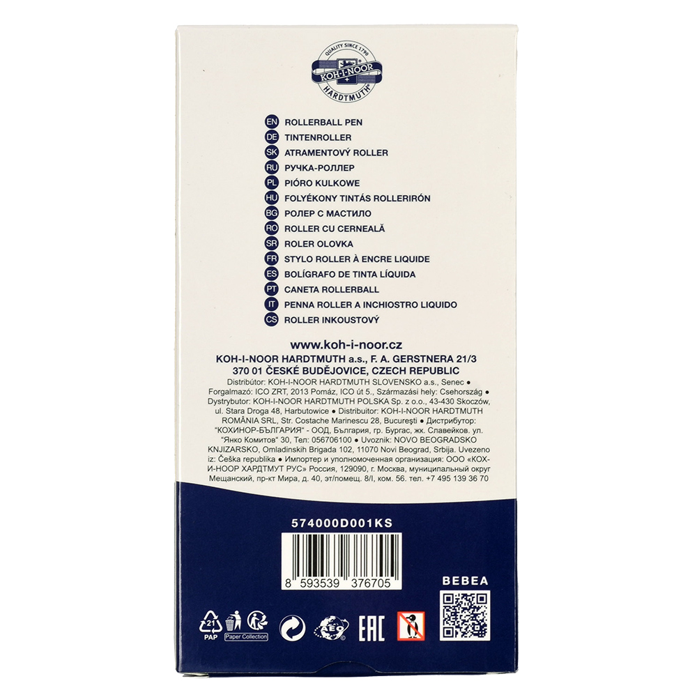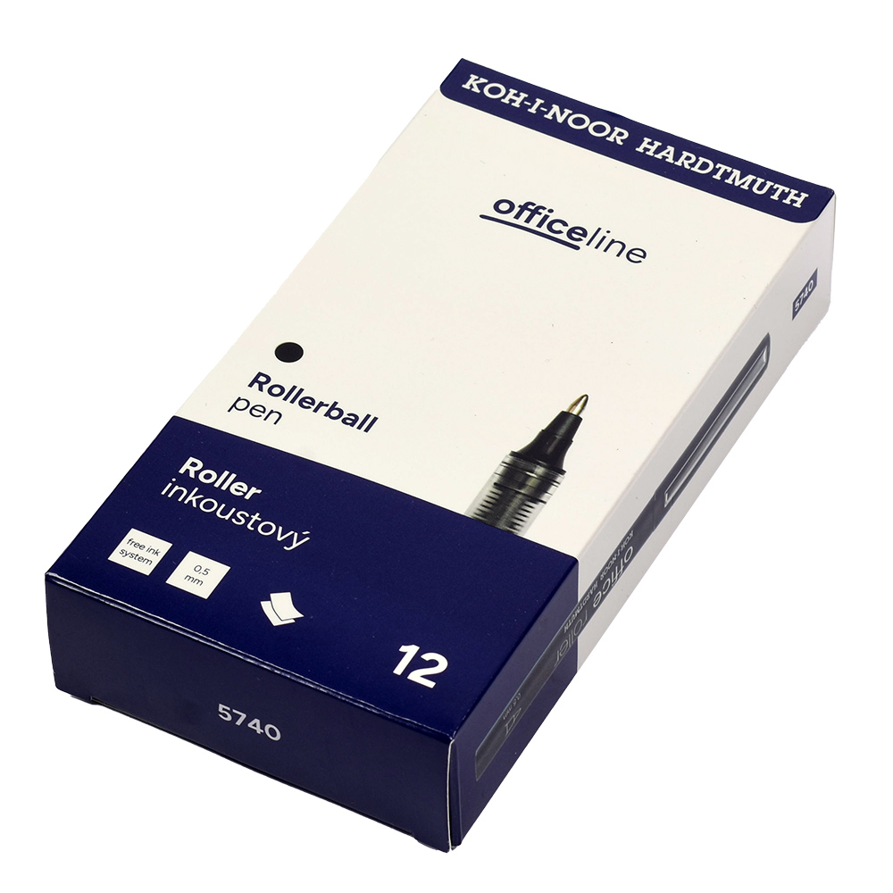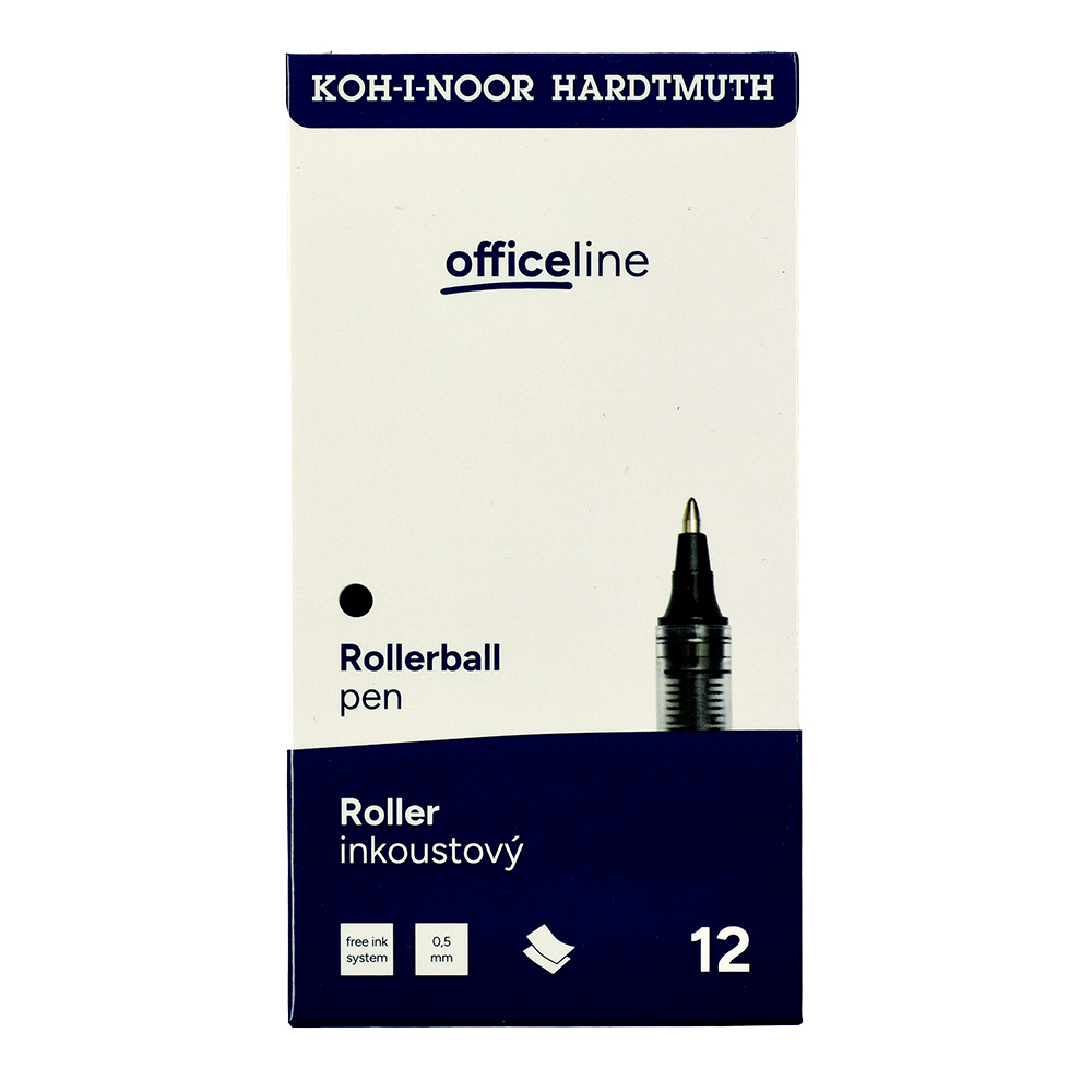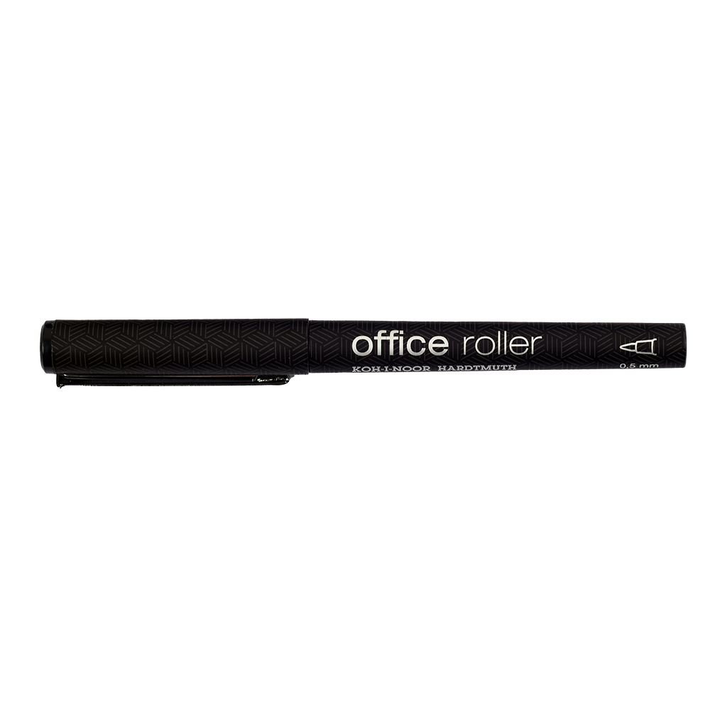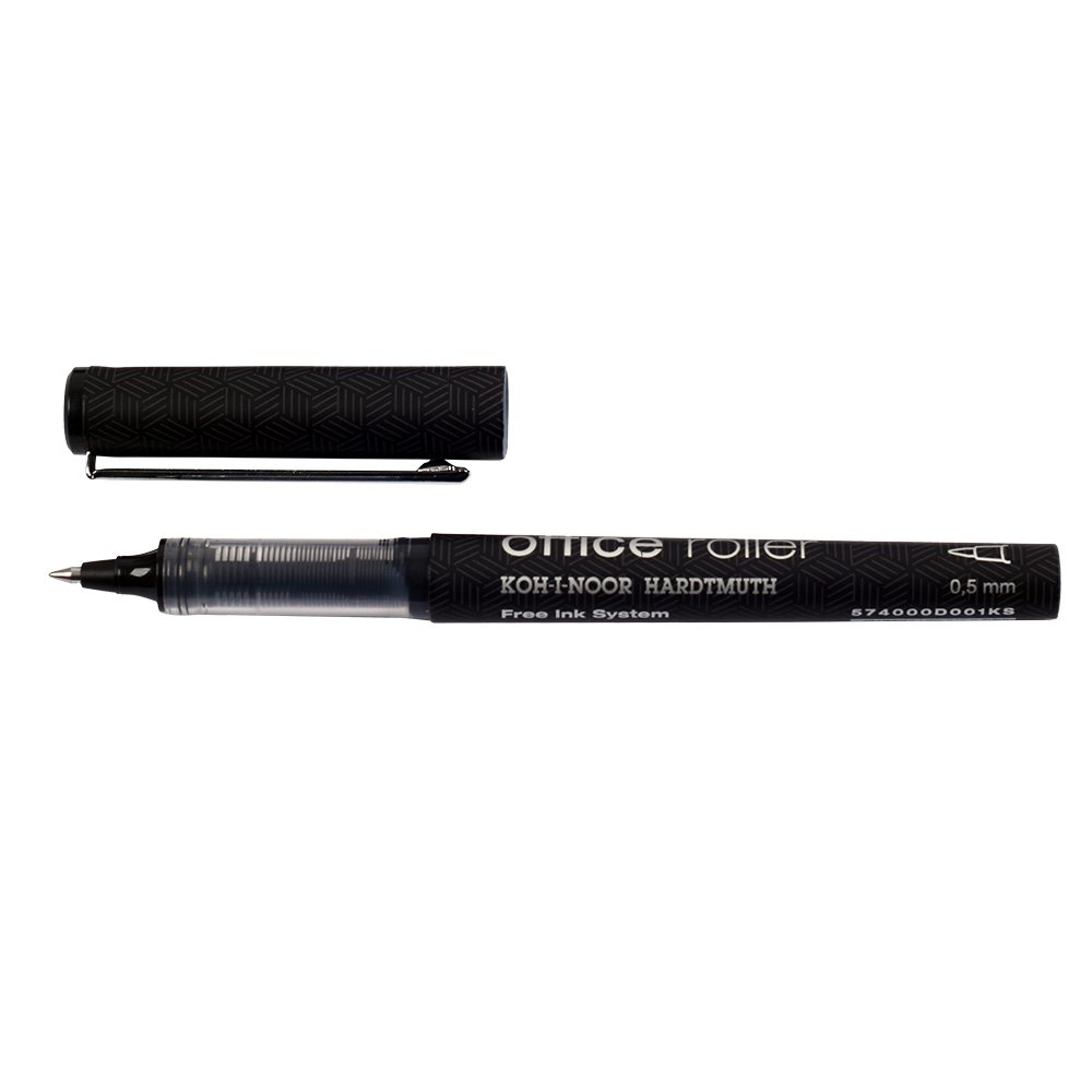 Ink rollerball pen with a metal clip. It has a conical metal ball tip and is filled with black ink. It provides an even, smooth line width of 0.5 mm and is ideal for everyday writing. Packaged in sets of 12 pieces in paper boxes.